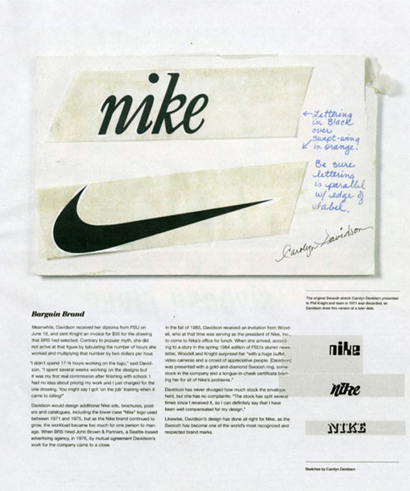Seguramente ya conoces la historia, el logotipo en la etapa cuando ya fue denominada NIKE fue desarrollado por una estudiante de diseño gráfico: Carolyn Davidson. Phil y Carolyn. La idea clave de Phil Knight era que el logotipo en su diseño debe transmitir movimiento. Carolyn Davidson dice basar la idea de la descripción gráfica en el ala de la diosa griega "Niké" para diseñar el símbolo dinámico que hoy en día vemos.