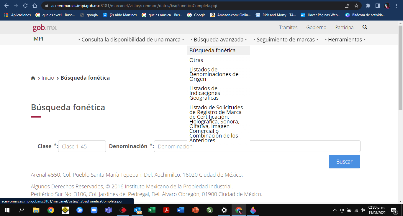 y en el apartado de búsqueda avanzada, seleccionar la opción de búsqueda fonética para poder conocer las marcas que ya existen que tienen un nombre igual o parecido a la que deseas registrar, además te puede decir cuáles son los giros comerciales a los que se dedica.