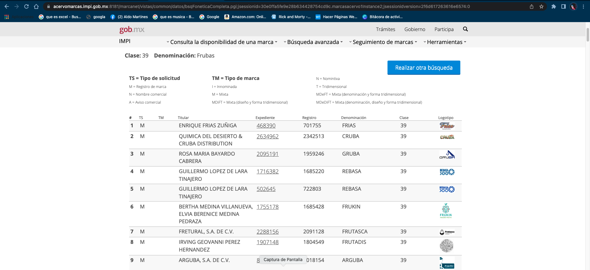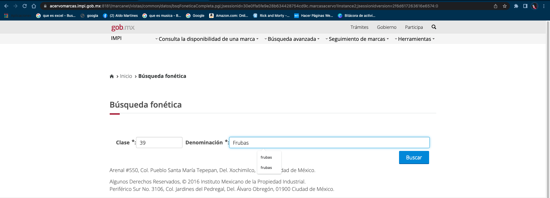 Ahora puedo proceder a realizar la búsqueda avanzada porque ya tengo mi bosquejo de marca y conozco la clasificación adecuada según IMPI para mi marca. En entonces en el apartado de clase coloco el número 39 y en el apartado de denominación coloco FRUBAS (doy clic en buscar).