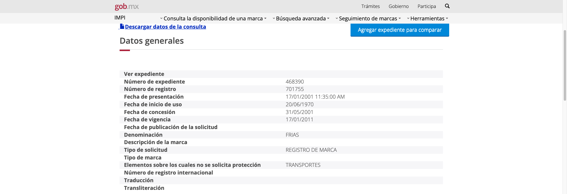 El primer registro que me aparece es de una solicitud de registro de marca (TS - M) por Enrique Frias Zúñiga, la denominación de su marca es: FRIAS (sin acento) clase 39. Me percato de que el nombre se parece fonéticamente, pero considero que se pueden diferenciar bastante bien porque esta marca utiliza los colores Azul, Naranja, Blanco y Negro en su logotipo; además la tipografía que Enrique usa para su marca es muy diferente, aun así investigaremos más a cerca de esta solicitud de registro. Ahora daremos clic en el número de expediente, en este caso es el número 468390.
