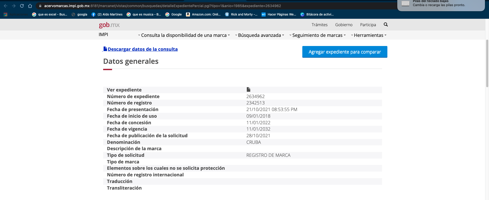 Pasemos a analizar el segundo resultado de nuestra búsqueda, la cual nos muestra una solicitud de registro de marca (TS - M) por parte de QUIMICA DEL DESIERTO & CRUBA DISTRIBUTION (Probablemente persona moral = Empresa) la cual coloca como denominación de su marca la palabra: CRUBA clase 39. Me percato que el nombre se parece fonéticamente, pero considero que se pueden diferenciar bastante bien porque esta marca utiliza los colores Verde, Café, Negro y Blanco; además la tipografía que esta empresa usa para su marca es muy diferente, sin embargo investigaremos más a cerca de esta solicitud de registro. Ahora daremos clic en el número de expediente, en este caso es el número 2634962.